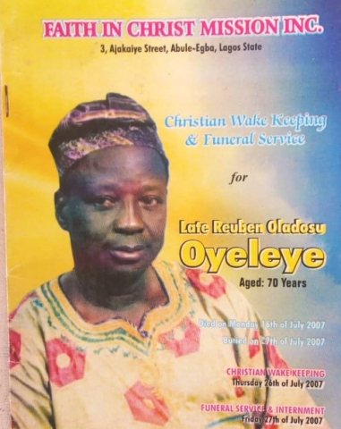 and Leke were from another marriage to Mrs. Lydia Oyeleye (Nee Davies). Oladosu Oyeleye died after a brief illness on 16" of July, 2007 at age 70 and was buried on 27" July 2007, at 14 Segun Alkinola Street Abule - Egba.